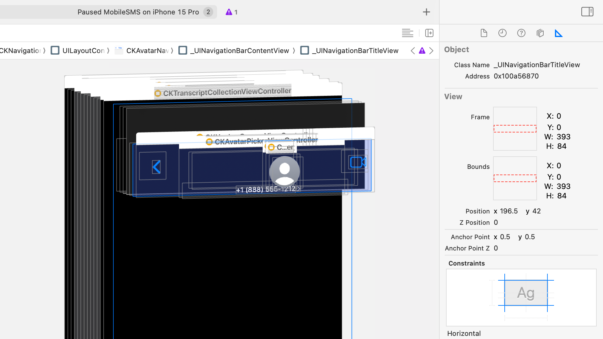 Taking a look at _UINavigationBarTitleView's class-dumped header file revealed a bunch of interesting properties and methods, not least a method named setHeight:! And, if we set a breakpoint for -[_UINavigationBarTitleView setHeight:] in Xcode, while attached to the MobileSMS process, the breakpoint is hit and the height is set to 84.0. Using Xcode's view hierarchy debugger and size inspector, we can see the _UINavigationBarTitleView's height is exactly 84 points high. This value propagates up the chain to the navigation bar content view, and the navigation bar itself. This looks like exactly what we want...