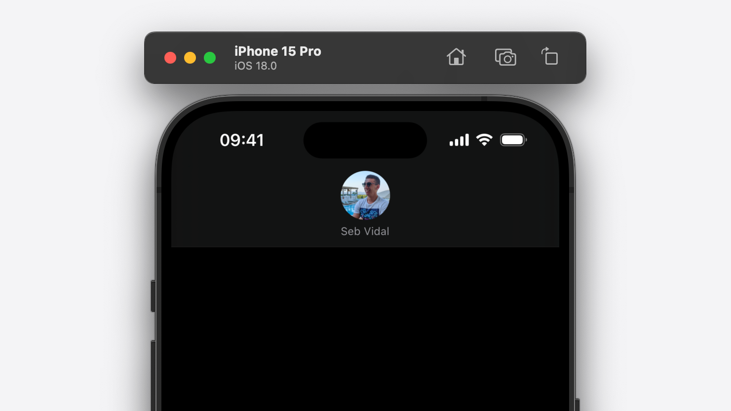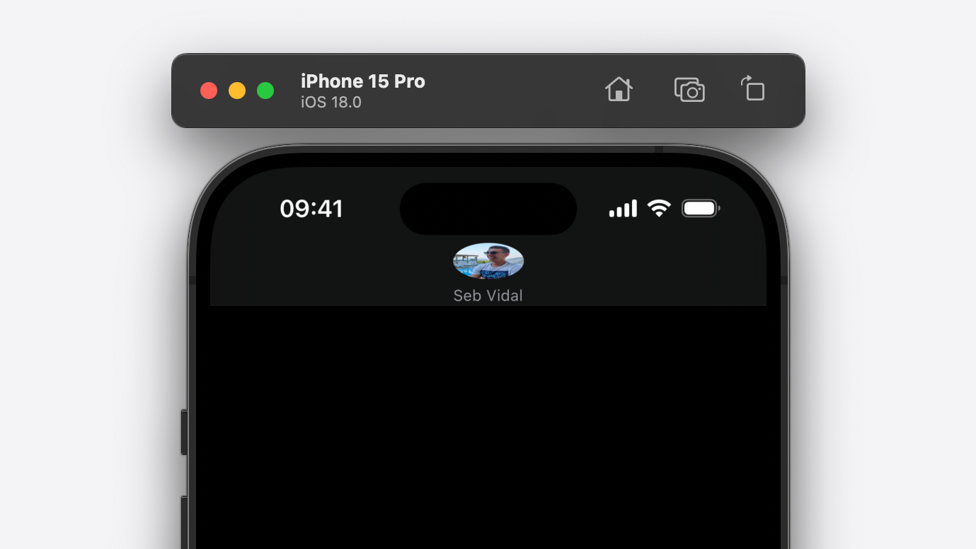 In the code above we initialise an instance of AvatarView, which is a custom UIView subclass comprising of a UIImageView and UILabel. We add the avatar view as a subview of our navigation bar title view; constraining the avatar view's top anchor to the title view's top anchor, plus 7 points of padding, and the avatar view's centre X anchor to the title view's centre X anchor, keeping it centred horizontally. Importantly, we don't constrain the avatar view's bottom anchor to the bottom anchor of the title view. This is because the height of the title view will change when the navigation controller is animating between views. If we were to constrain the avatar view's bottom anchor to the title view's bottom anchor, our avatar view's subviews will get compressed as the height of the navigation bar animates up and down. Here's what that looks like...