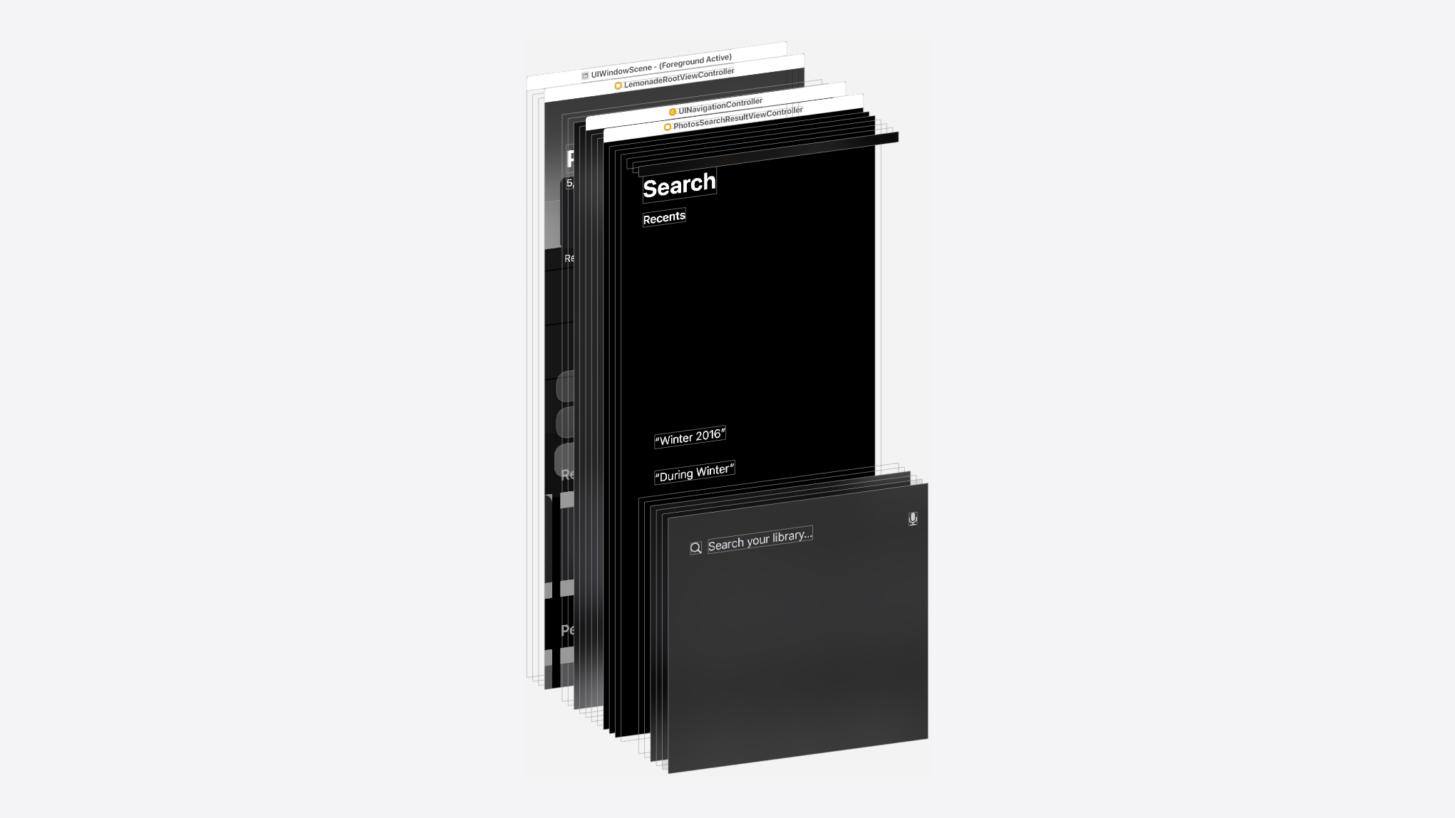 The first thing we can ascertain is that they're using a lot of SwiftUI here. The telltale sign is that the UIWindow's root view controller is a UIHostingController subclass named LemonadeRootViewController. This view controller's view is an instance of _UIHostingView and almost all of the user interface elements are composited directly into this view's CALayer. The result of this is that we can't inspect individual UI elements as closely, presumably because Apple makes liberal use of SwiftUI's drawingGroup() view modifier here for better performance.