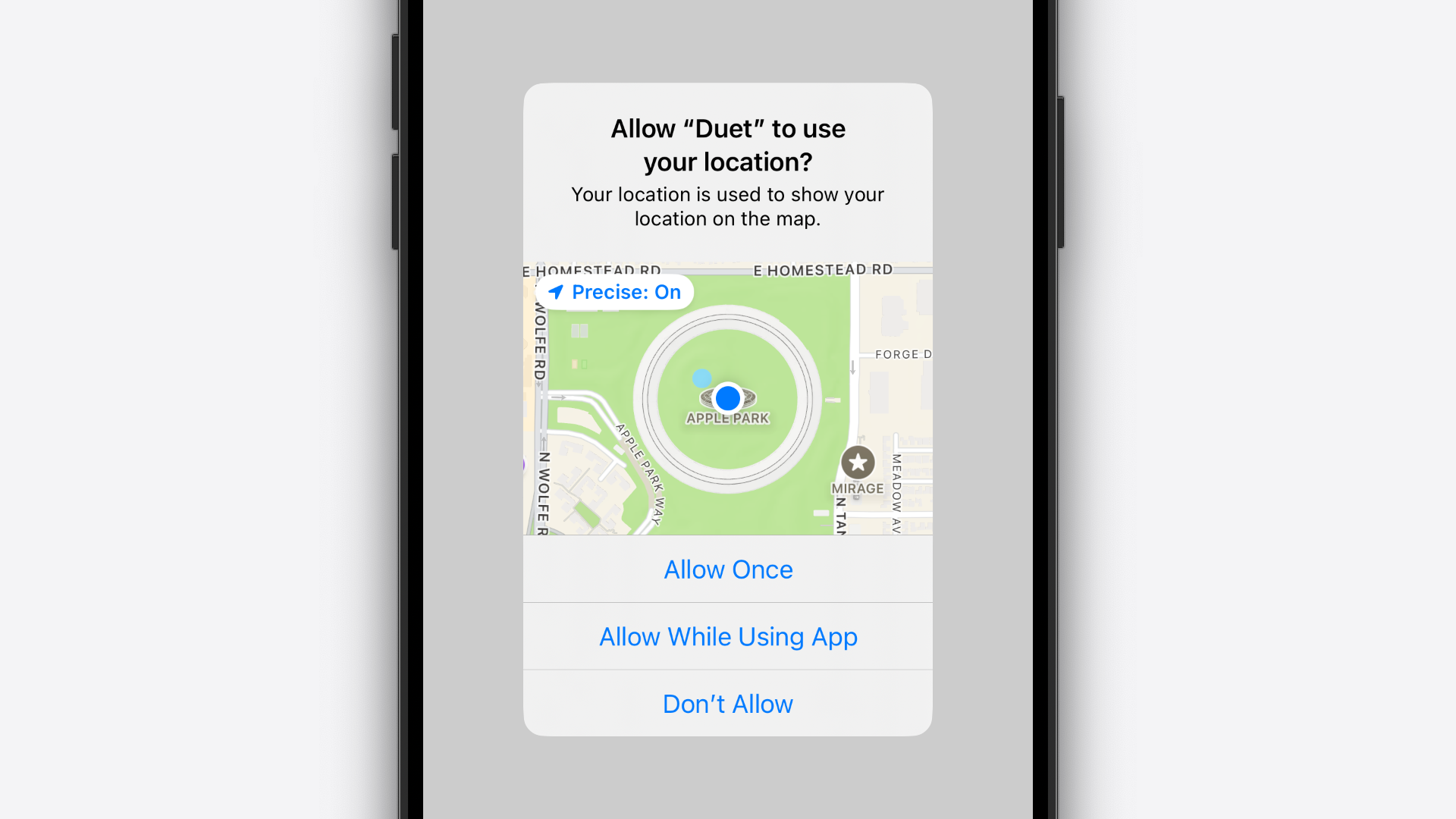 Another example is the system alert displayed when an app requests to access your location, this time showing the usual title and message, but also a map view with your current location.